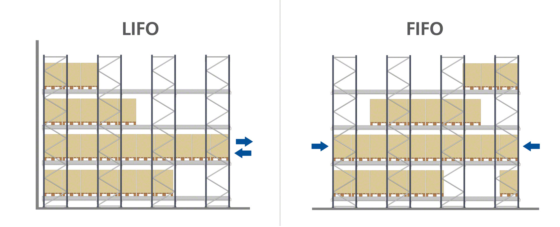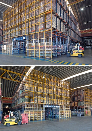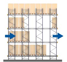 - Povećani broj paleta u dubinu: skladišni kanali mogu prelaziti 40 m. Ograničenje visine uvjetovano je korištenim sredstvima za rukovanje.